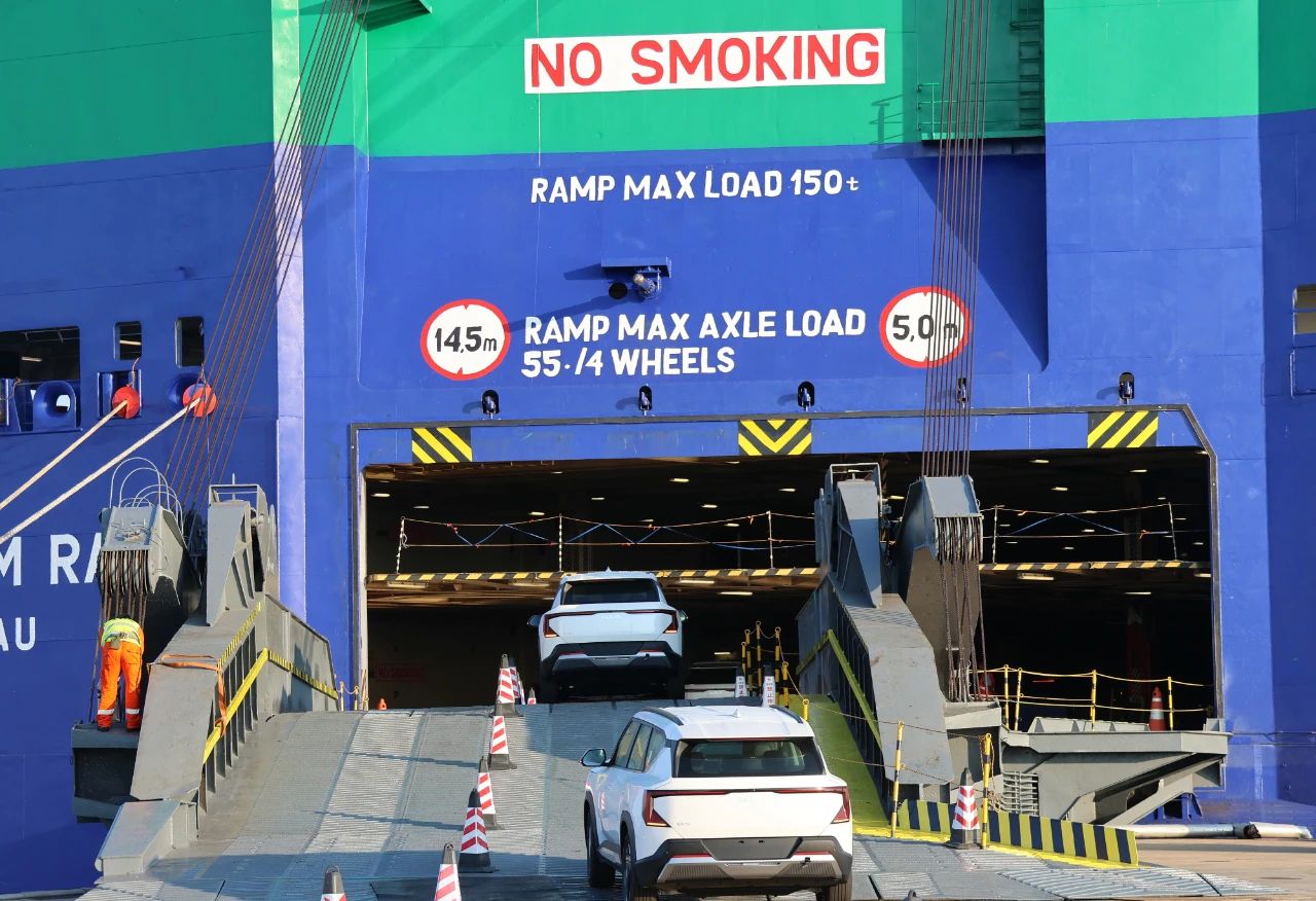 4179輛悅達起亞商品汽車駛過約2.5公里長的棧橋,到達集裝箱碼頭,最后登上貨輪,被穩當固定在多層貨架上。由于棧橋一期碼頭正在維修,只能半幅通車,因此共用此棧道的其他貨物運輸停止作業,為商品汽車通行讓道。