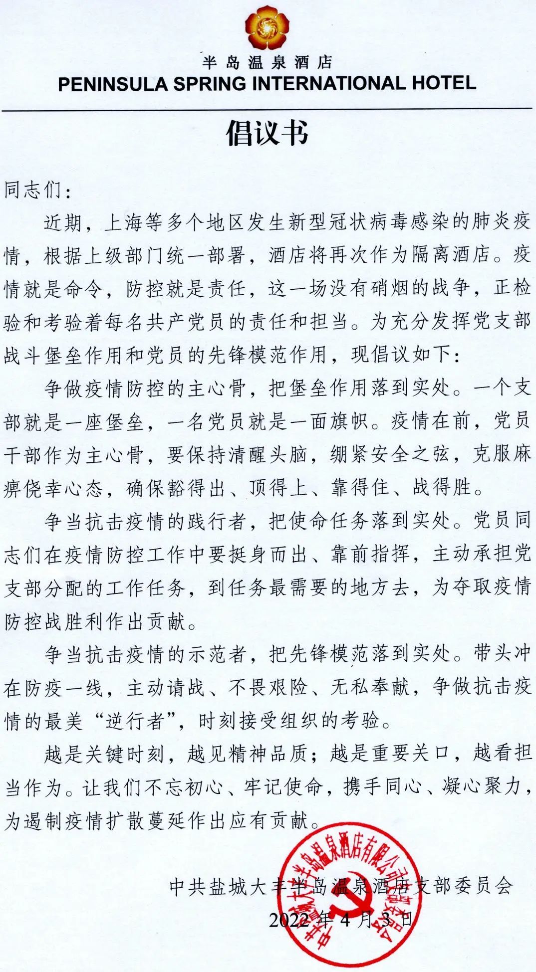 “我請?jiān)福鹤栽竻⒓泳频暌痪€防疫工作,充分發(fā)揮黨員先鋒帶頭作用,堅(jiān)決打贏疫情防控阻擊戰(zhàn)。”“我請?jiān)福鹤鰢?yán)明紀(jì)律的踐行者,做擔(dān)當(dāng)履職的戰(zhàn)斗員,請領(lǐng)導(dǎo)批準(zhǔn)我參與此次隔離任務(wù)。”“我是一名入黨積極分子,我志愿參與酒店疫情防控任務(wù),請讓我上一線”……一封封按著紅色手印的《請戰(zhàn)書》被遞交到鹽城港文旅集團(tuán)旗下半島溫泉酒店黨支部。
