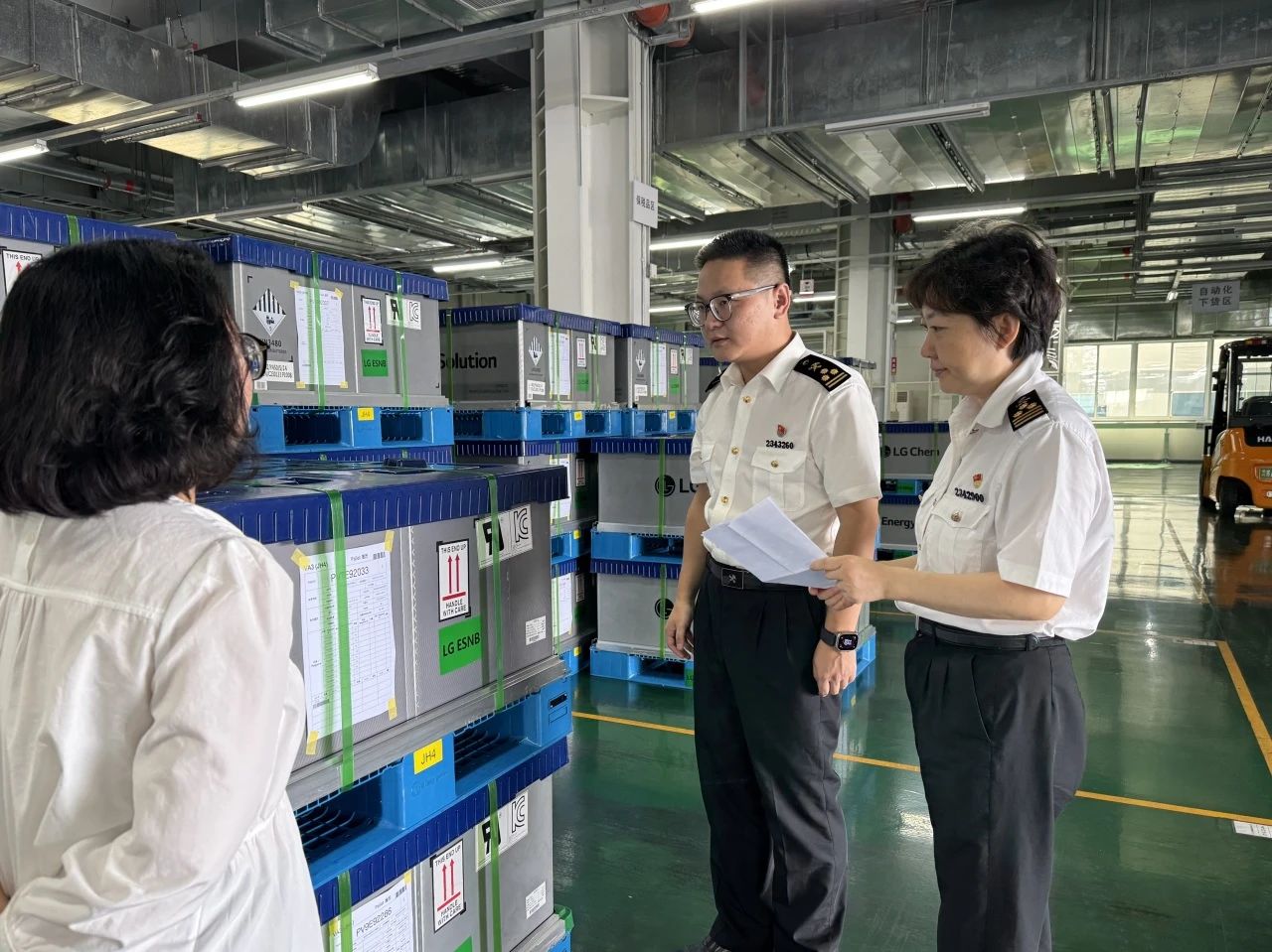 圖為:金陵海關(guān)關(guān)員對出口鋰電池循環(huán)包裝開展現(xiàn)場查驗。李巖/攝