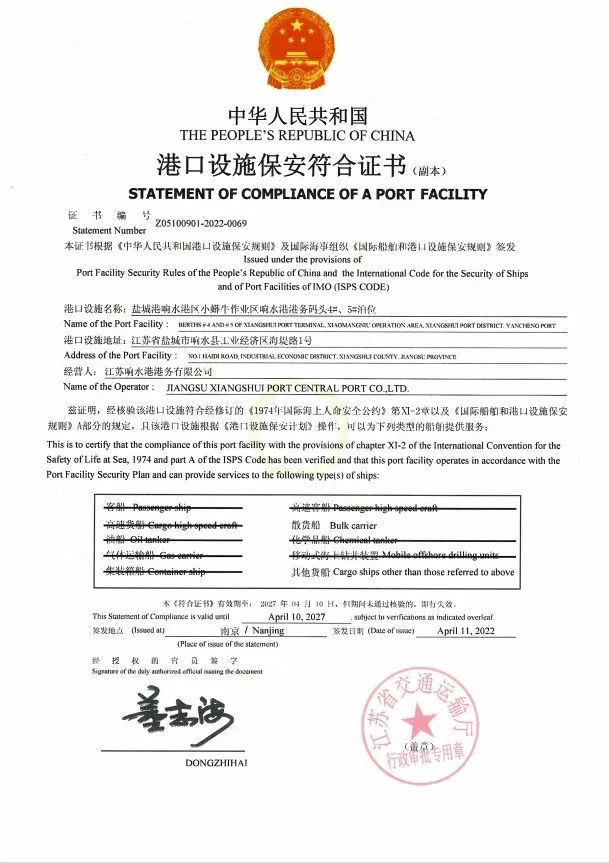 近日,在省、市相關(guān)部門、專家和咨詢單位的大力支持幫助下,響水港區(qū)、射陽(yáng)港區(qū)10個(gè)萬(wàn)噸級(jí)以上泊位順利獲得江蘇省交通運(yùn)輸廳核發(fā)的港口設(shè)施保安符合證書,為響水港區(qū)、射陽(yáng)港區(qū)一類開放口岸國(guó)家級(jí)驗(yàn)收奠定了堅(jiān)實(shí)基礎(chǔ)。