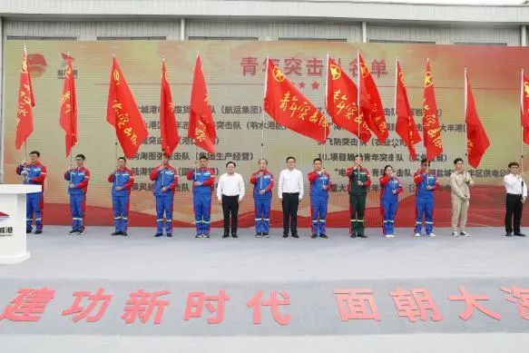 活動中,與會領導為12個圍繞服務重大項目而組成的青年集體突擊隊進行授旗,青年突擊隊、青年文明號代表作表態發言,并舉行了“強國復興有我 青春燃在海港”鹽城港青年宣誓儀式。