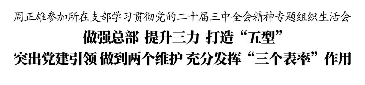8月14日,集團機關(guān)第一黨支部召開學(xué)習(xí)貫徹黨的二十屆三中全會精神專題組織生活會,集中學(xué)習(xí)習(xí)近平總書記關(guān)于推動機關(guān)黨建高質(zhì)量發(fā)展作出的重要指示精神。集團黨委書記、董事長周正雄以普通黨員身份參加會議。