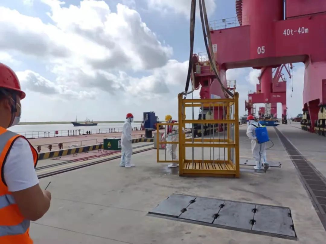 本次演練模擬了港區靠泊船舶發現發熱船員的應急處置流程。演練中,港口調度員接到預警報告后,第一時間向指揮組報告情況,指揮組接到險情后立即向區防控辦上報,并啟動防疫應急預案,進行現場處置?,F場救援組對碼頭現場進行封閉,用門機吊籃將發熱人員轉移至碼頭面,并使用港區疫情防控專用轉運車輛將發熱人員轉送射陽縣人民醫院發熱門診,同時對碼頭面及門機吊籃用75%的酒精原液進行消毒處理。