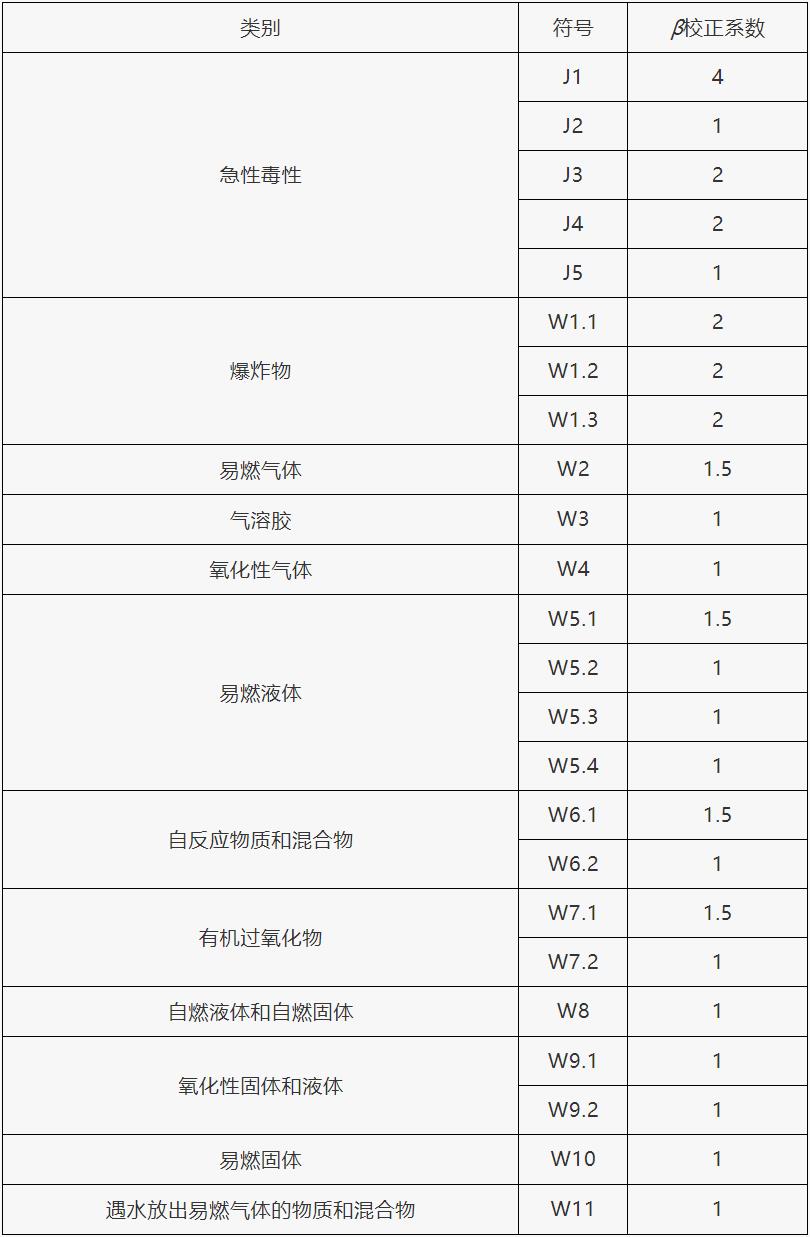 根據(jù)單元內(nèi)危險(xiǎn)貨物的類(lèi)別不同,設(shè)定校正系數(shù)(β)值,在表1范圍內(nèi)的危險(xiǎn)貨物,其β值按表1確定,未在表1范圍內(nèi)的危險(xiǎn)貨物,其β值按表2確定。
