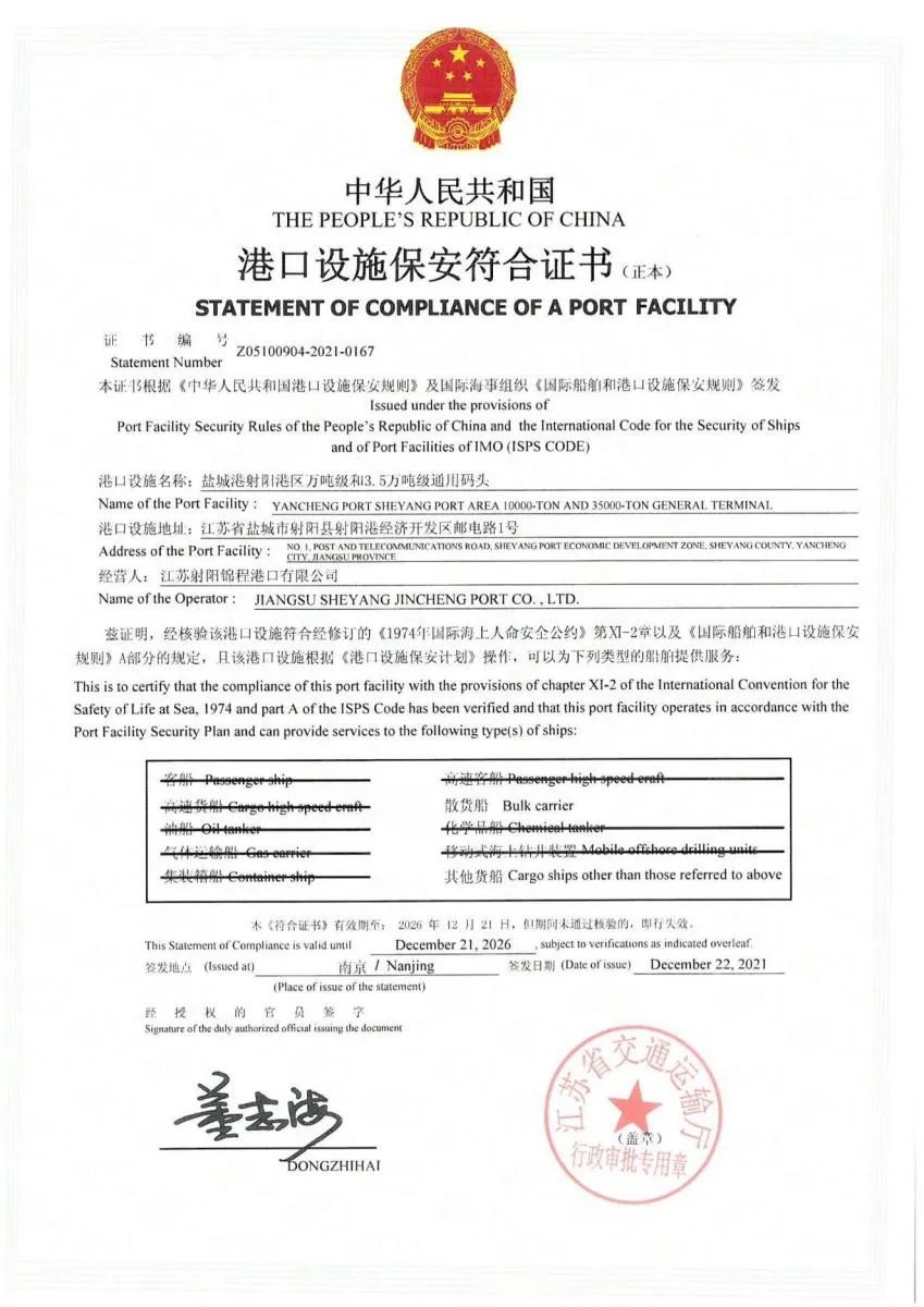 12月21日,經過射陽港區項目條線人員近三個月的不懈努力,在各主管部門和專業咨詢單位的支持配合下,鹽城港射陽港區順利取得江蘇省交通運輸廳核發的港口設施保安符合證書,這一證書的成功獲批,為射陽港區一類開放口岸國家級驗收奠定了堅實基礎。