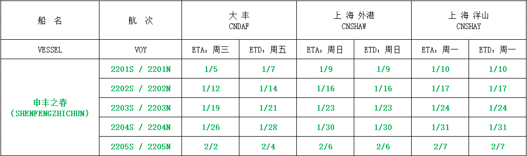 滬鹽專線2022年1月份沿海線船期表