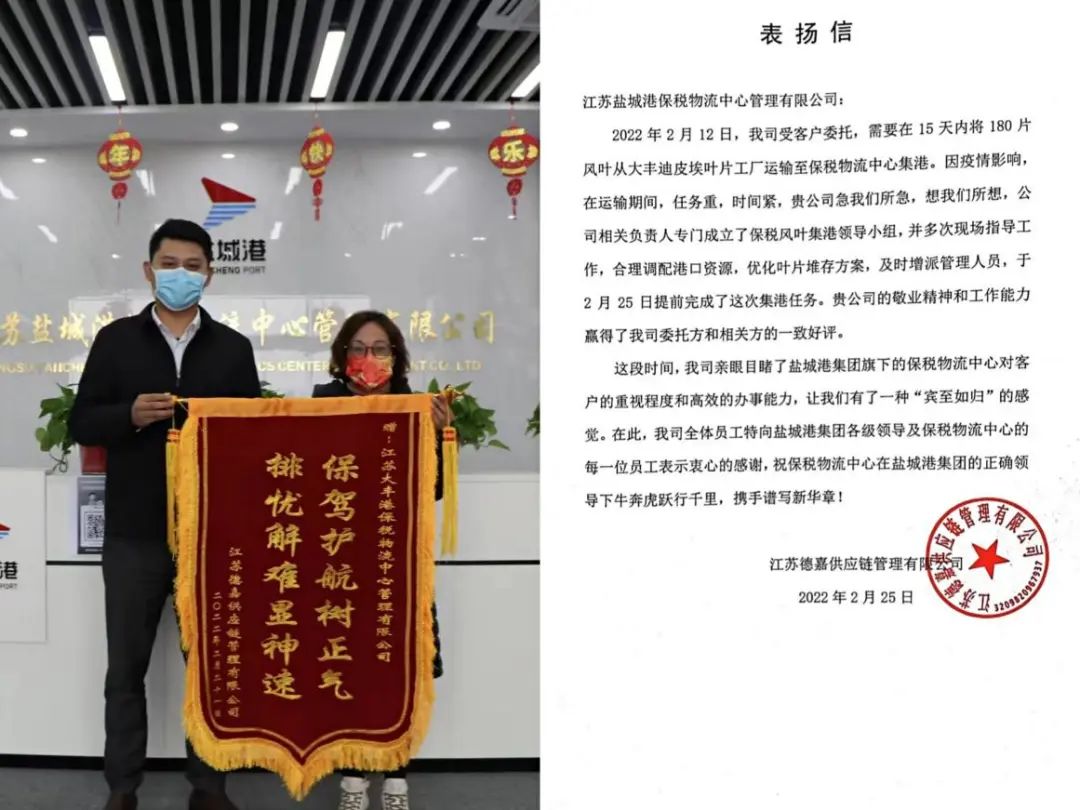 鹽城港保稅物流中心圍繞集團黨委“經營興航年”“改革攻堅年”部署要求,秉承“客戶至上,服務為本”的經營理念,不斷提升服務水平,提高專業素養。同時,保稅物流中心為切實做好疫情防控工作,針對進出貨物采取劃界作業,裝卸專班人員區域內作業等要求,真正做到了生產經營、疫情防控兩手抓、兩手硬、兩不誤。細致周到、高效便捷的服務也贏得了社會各界的廣泛贊譽,部分客戶還特意送來了錦旗和感謝信以表達他們的感激之情。