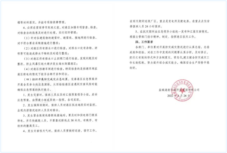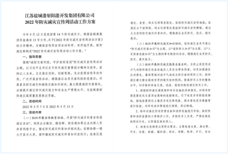 今年5月12日是我國第14個防災減災日,根據鹽城港集團蘇鹽港安13號文件,關于《2022年防災減災宣傳周活動方案》的文件精神,圍繞“減輕災害風險,守護美好家園”防災減災宣傳周活動主題,以習近平總書記關于防災減災重要指示精神為指導,堅持以人為本,立足港區實際,廣泛開展宣傳周各項活動,增強港區全員災害風險防范意識,全面提升港區防災減災抗災能力和安全生產管理水平。