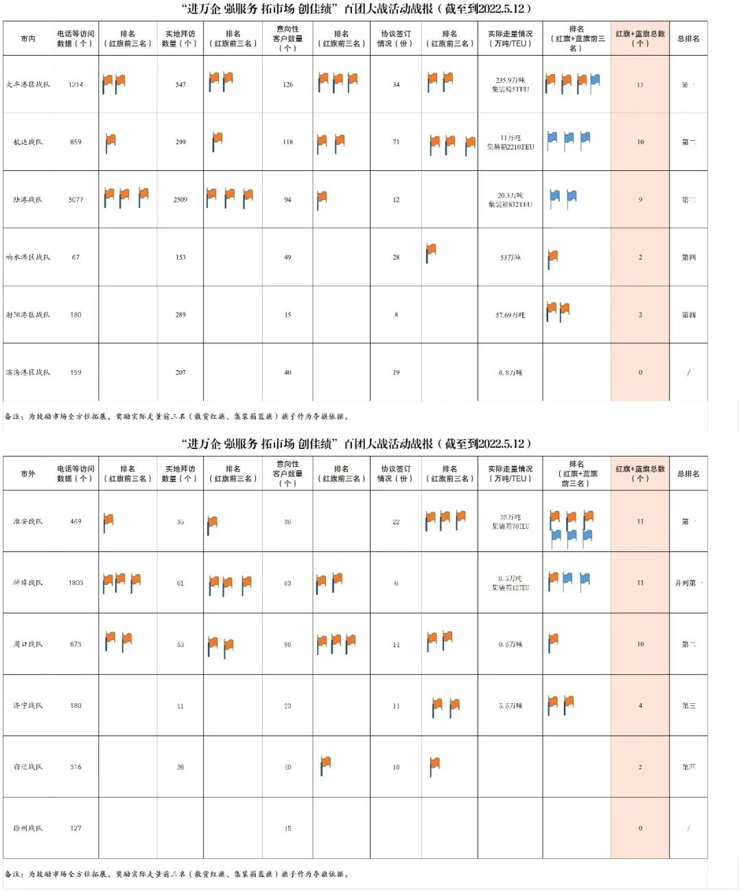 各戰隊累計拜訪客戶數據13314家,其中電話、視頻等訪問9124家,實地拜訪4190家,意向性客戶705家,簽訂協議238份,實際走量428.19萬噸、3129TEU。具體細分如下: