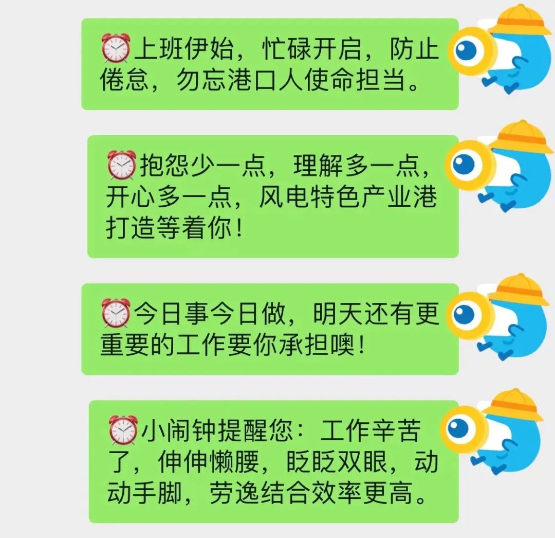 叮鈴鈴,“上班伊始,忙碌開啟,防止倦怠,勿忘港口人使命擔當。”每天一上班,打開電腦,首先彈出上述信息。這是射陽港區新增設的辦公“鬧鐘小貼士”的管家信息。提醒各位員工,作為鹽城港人,要時刻不忘肩負的“架起鹽城走向世界海上大通道”時代使命,必須時刻保持永不懈怠、奮發拼搏的精神狀態,做好自己的本職工作。