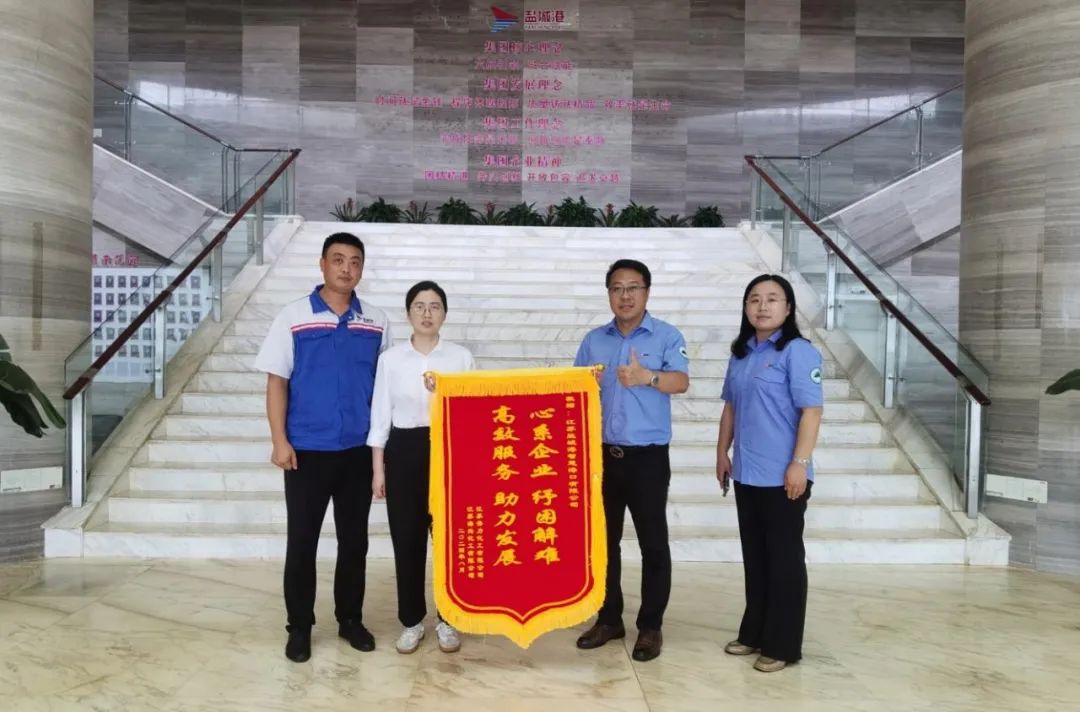 近日,江蘇海力化工有限公司和江蘇海興化工有限公司將一面印有“心系企業(yè) 紓困解難 高效服務(wù) 助力發(fā)展”的錦旗送到鹽城港智慧港口公司,對智慧港口公司在船舶作業(yè)期間優(yōu)質(zhì)專業(yè)高效的服務(wù)表示感謝。