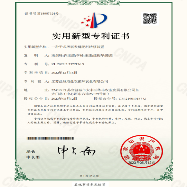 扎實(shí)推進(jìn)科研創(chuàng)新,不斷將理論研究成果轉(zhuǎn)化到實(shí)際生產(chǎn)過程與產(chǎn)品中,截至目前,鹽農(nóng)循環(huán)農(nóng)業(yè)先后取得了3個(gè)肥料登記證,獲得自主研發(fā)專利24項(xiàng)(其中發(fā)明專利4項(xiàng)),另外還有15項(xiàng)專利已受理。率先使用新型機(jī)械沼液還田機(jī),實(shí)現(xiàn)沼液在旱作物大面積推廣施用,替代70%以上化肥用量,將理論轉(zhuǎn)化為實(shí)際。“沼液在稻麥輪作上施用技術(shù)規(guī)范”地方標(biāo)準(zhǔn)成功立項(xiàng),為沼液推廣應(yīng)用打下堅(jiān)定的基礎(chǔ)。 申報(bào)成功國(guó)家高新技術(shù)企業(yè)、江蘇省農(nóng)業(yè)科技型企業(yè)、江蘇省三星上云企業(yè)、市級(jí)農(nóng)業(yè)產(chǎn)業(yè)化龍頭企業(yè)等稱號(hào)。與揚(yáng)州大學(xué)等高校共同申報(bào)的2022年江蘇省碳達(dá)峰碳中和科技創(chuàng)新專項(xiàng)資金項(xiàng)目-沿海灘涂農(nóng)田生態(tài)碳匯能力提升模式構(gòu)建和試驗(yàn)示范基地建設(shè)也正在按進(jìn)度穩(wěn)步推進(jìn)。