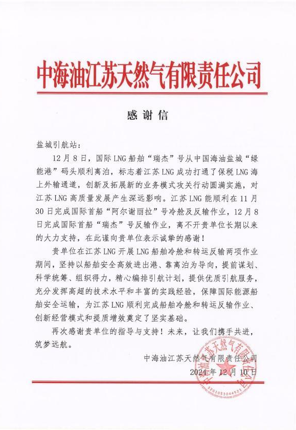 近日,鹽城港引航站收到了一封來(lái)自中海油江蘇天然氣有限責(zé)任公司的感謝信,信中對(duì)鹽城港引航站近期為江蘇LNG船舶的安全高效運(yùn)營(yíng)及長(zhǎng)期以來(lái)的優(yōu)質(zhì)服務(wù)表示衷心感謝。