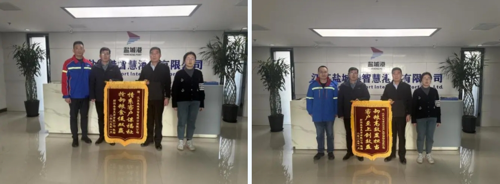 1月13日,射陽春蕾麥芽有限公司分別對智慧港口公司和興農公司贈送寫有“情系客戶謀福祉 搶卸糧食保雙贏”“卸糧高效顯擔當 客戶至上創效益”字樣的錦旗,為智慧港口公司在“廣航2”輪大麥中轉作業中所展現的高效與優質服務表示感謝,同時亦是對興農公司精心構建的集“運輸、中轉、倉儲”于一體的全流程綜合服務表示肯定。
