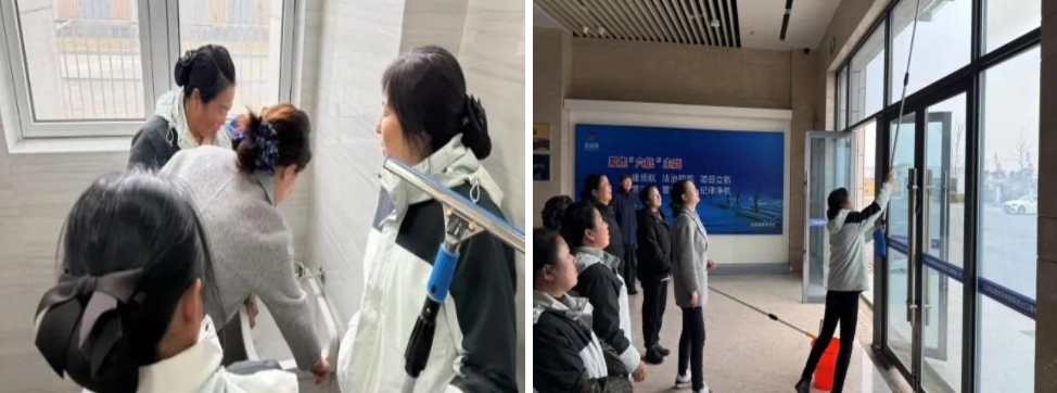 培訓(xùn)現(xiàn)場圍繞重點區(qū)域清潔、保潔工具使用技巧、保潔頻次和保潔規(guī)范等方面,采用現(xiàn)場教、實地訓(xùn)的方式,詳盡重點,確保每位保潔員都能將作業(yè)技巧、標(biāo)準(zhǔn)要求了然于心。實操中,保潔組全員化身“清潔奇兵”,各司其職,嚴(yán)格按規(guī)范操作,以日常保潔、深度清潔、機(jī)制清潔的高標(biāo)準(zhǔn),為港區(qū)營造了干凈、整潔的工作環(huán)境。