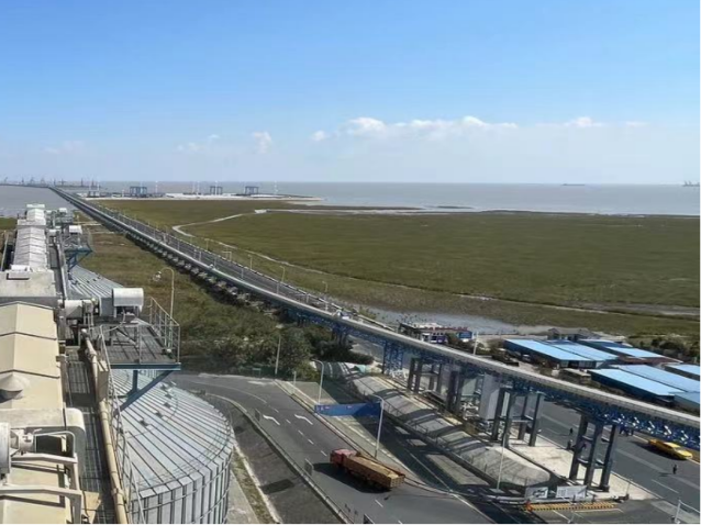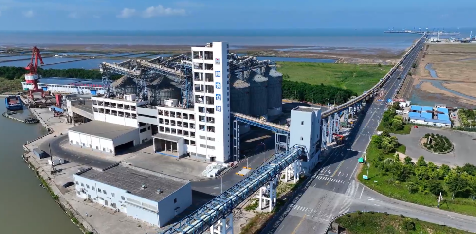 藍色的全封閉式散糧輸送機連接天與海,從碼頭延伸至糧食筒倉,遠遠看去,宛若一條水龍,盤旋纏繞在倉頂。在自動化控制系統的加持下,糧食運輸的流量和方向精準無誤,智能化作業效率提檔加速,人工成本和粉塵污染不斷減少,輸送損耗率下降至零,儼然成為糧食高效運作的“主力軍”。