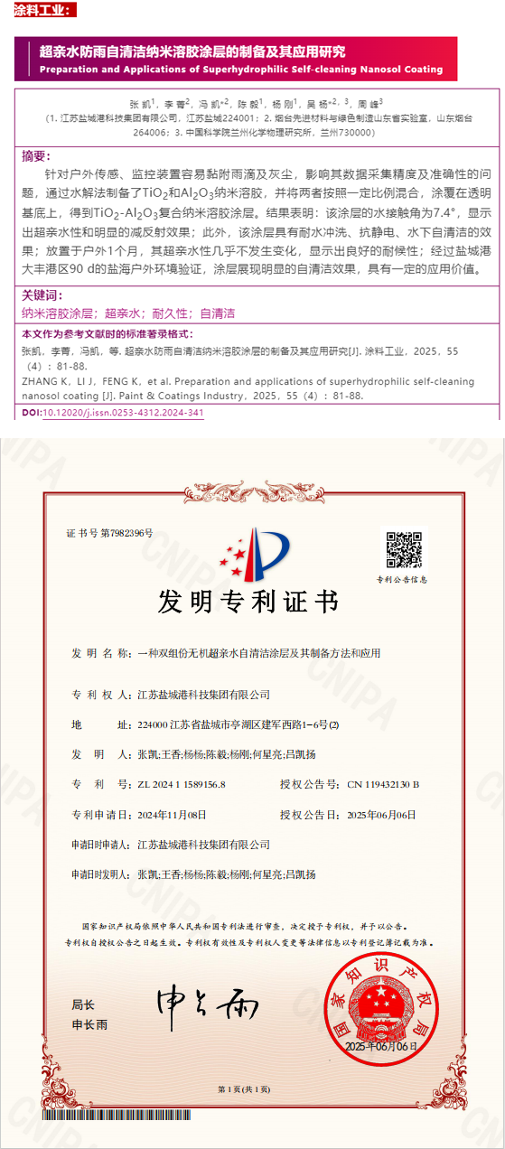 課題研究內容為針對雨天作業(yè)過程中對司機及感知傳感器的影響,從超親水防雨涂層材料方面出發(fā),開發(fā)一種高性能、長期效港口感知傳感器鏡頭表面的超親水防雨涂層材料,為港口運行提供安全保障。依托該課題,科技集團取得《一種雙組份無機超親水自清潔涂層及其制備方法和應用》發(fā)明專利1項,在核心期刊《涂料工業(yè)》發(fā)表《超親水防雨自清潔納米溶膠涂層的制備及其應用研究》論文1篇。