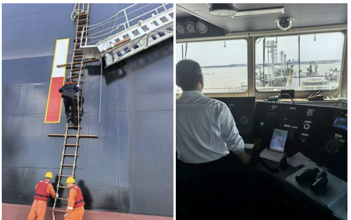 為確保此次高危試航萬無一失,鹽城港引航站提前72小時啟動應急機制,通過三維模擬推演,最終確定以“雙拖輪前置頂推+三拖輪尾舵輔助”的五拖輪陣型護航,將船舶漂移控制在米級。靠泊前,引航員登輪完成全船安全掃描,并與海事部門建立秒級通訊鏈路以共享實時動態。作業中,引航員在100號浮彎道精準利用水流變化,安全完成55度轉向;靠泊時更通過視覺與激光雙重校驗,將觸碰速度控制在0.05節(相當于人步行的1/20),完美避免低溫船體因沖擊受損。