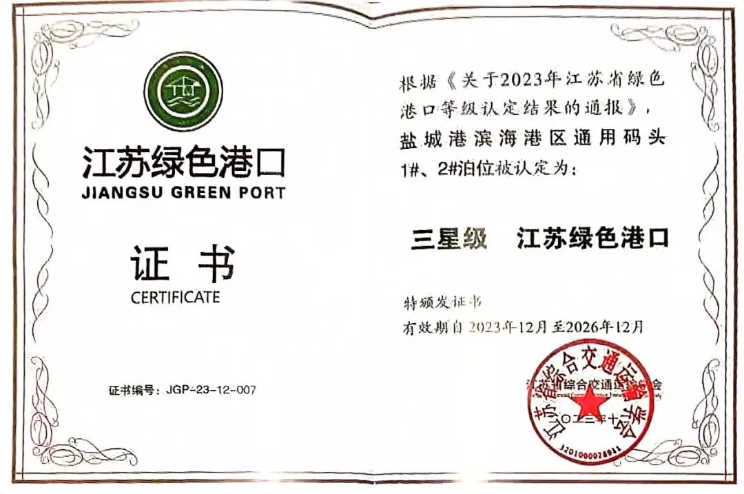 濱海港區(qū)獲得“江蘇省三星級(jí)綠色港口”榮譽(yù)稱(chēng)號(hào)