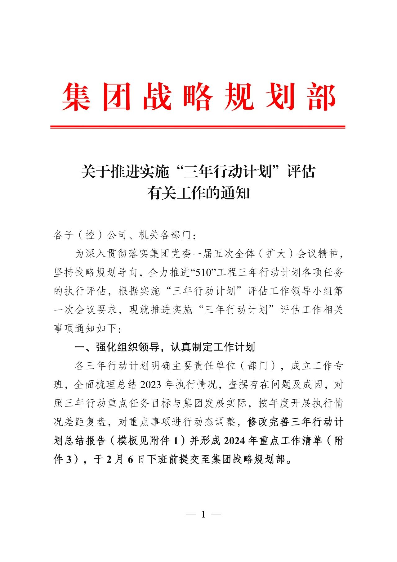 2024年是集團(tuán)全面完成“十四五”規(guī)劃目標(biāo)任務(wù)的關(guān)鍵之年,為深入貫徹集團(tuán)黨委一屆五次全體(擴(kuò)大)會(huì)議精神,在三年行動(dòng)計(jì)劃上突出落地見效,以三年計(jì)劃的完成保證“十四五”各項(xiàng)目標(biāo)任務(wù)如期實(shí)現(xiàn)。“三年行動(dòng)計(jì)劃”評估工作領(lǐng)導(dǎo)小組辦公室緊緊圍繞集團(tuán)三步走戰(zhàn)略發(fā)展總體要求,完善“專班化推進(jìn)+項(xiàng)目化實(shí)施”運(yùn)作方式,做好階段性評估,常態(tài)化督查,扎實(shí)推進(jìn)“510”工程等三年行動(dòng)計(jì)劃各項(xiàng)工作走深走實(shí)。