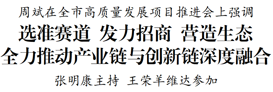 5月24日至25日,全市高質(zhì)量發(fā)展項目推進會召開。市委書記周斌出席并講話。他強調(diào),要深入學(xué)習(xí)貫徹習(xí)近平新時代中國特色社會主義思想,全面落實“四個走在前”重大任務(wù),加快推動產(chǎn)業(yè)鏈與創(chuàng)新鏈深度融合,以科技創(chuàng)新支撐引領(lǐng)經(jīng)濟高質(zhì)量發(fā)展,努力推動經(jīng)濟運行率先整體好轉(zhuǎn),為競逐新賽道、勇當(dāng)排頭兵注入強大動能。市委副書記、代市長張明康主持會議,市人大常委會主任王榮,市委副書記、統(tǒng)戰(zhàn)部部長羊維達參加。