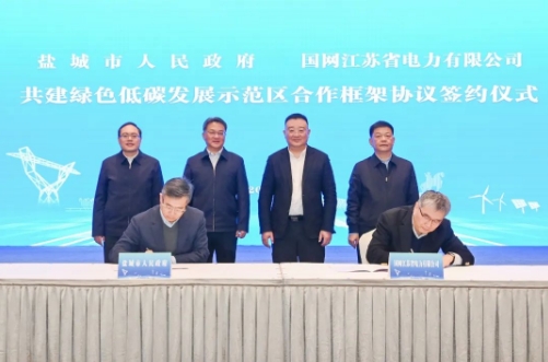 1月4日,鹽城市政府與國網江蘇省電力有限公司簽署共建綠色低碳發展示范區合作框架協議。市委書記周斌,市委副書記、市長張明康會見國網江蘇電力董事長謝永勝一行,并共同見證簽約。