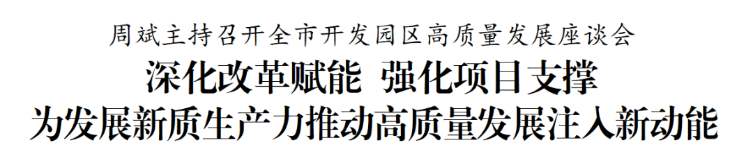 4月22日,市委書記周斌主持召開全市開發園區高質量發展座談會,聽取情況匯報,研究分析問題,部署落實工作。他強調,要認真學習貫徹習近平總書記重要講話重要指示精神,完整準確全面貫徹新發展理念,按照省委決策部署,緊緊圍繞發展新質生產力,用好改革關鍵一招,加大科技創新力度,強化重大產業項目支撐,努力為全市高質量發展注入新動能。
