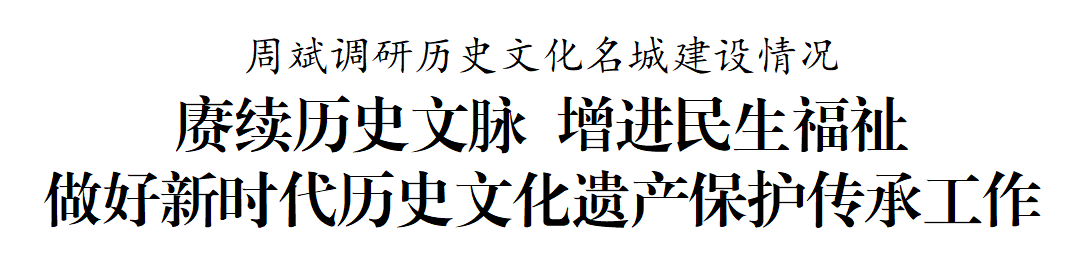 周斌在調(diào)研時(shí)強(qiáng)調(diào),歷史是城市的記憶,文化是城市的靈魂。各地各部門要堅(jiān)定文化自信,堅(jiān)持守正創(chuàng)新,自覺扛起歷史文化遺產(chǎn)保護(hù)傳承的政治責(zé)任,以繡花功夫守護(hù)歷史文化遺產(chǎn)、延續(xù)鹽城文脈,開創(chuàng)新時(shí)代歷史文化遺產(chǎn)保護(hù)傳承工作新局面。要正確處理好傳統(tǒng)與現(xiàn)代、保護(hù)與發(fā)展的辯證關(guān)系,充分挖掘利用歷史文化遺產(chǎn)的多重價(jià)值,以改革創(chuàng)新精神推動(dòng)歷史文化遺產(chǎn)創(chuàng)造性轉(zhuǎn)化、創(chuàng)新性發(fā)展。
